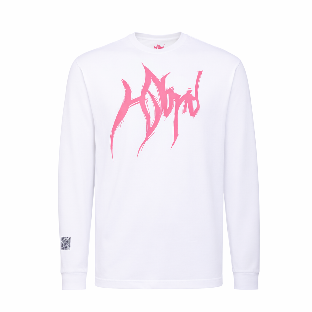 A white crew neck long sleeve made from 235gr heavy cotton, designed for a clean streetwear look. Features the pink HYBRID screen-printed logo on the front and a QR accent on the sleeve.