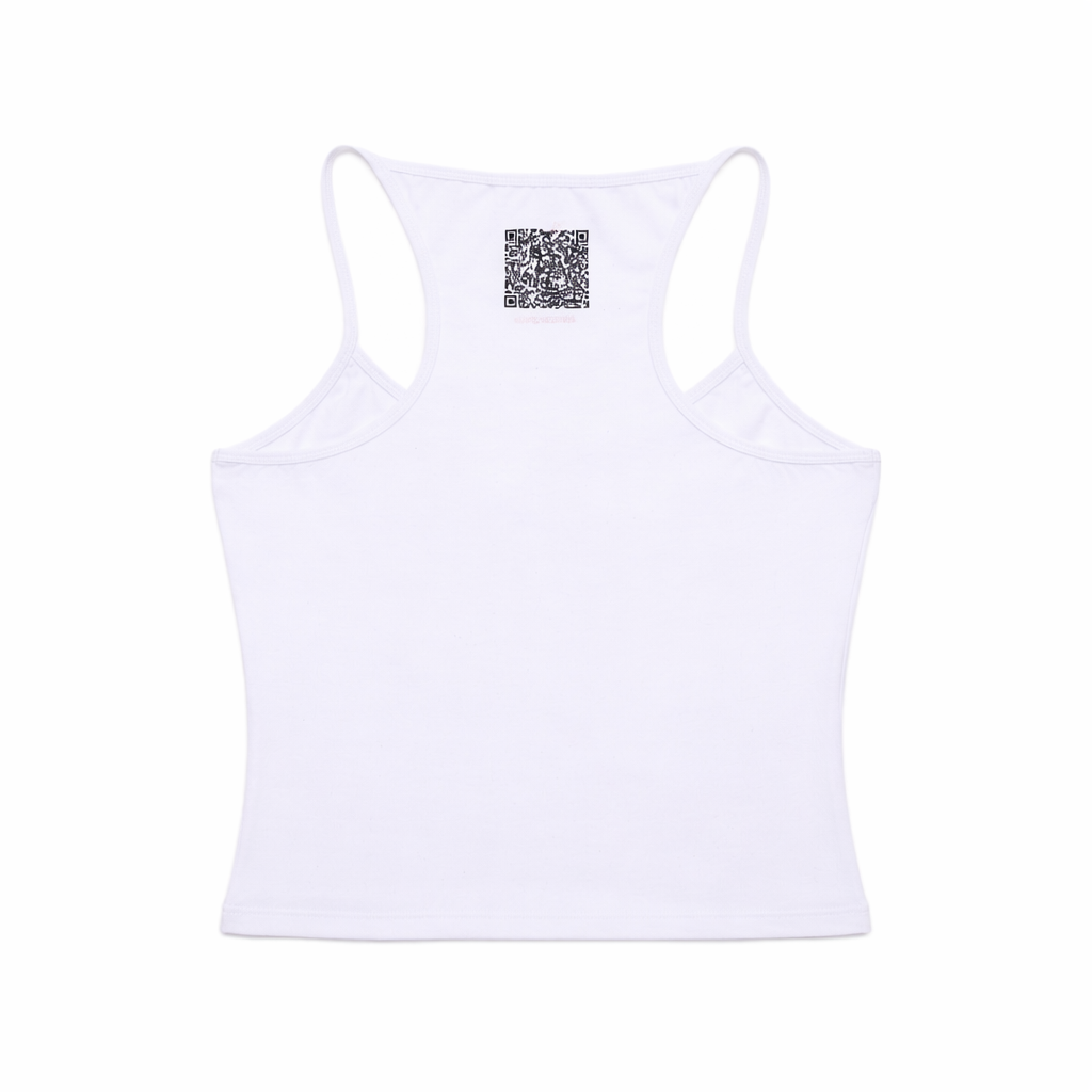 A clean white tank top featuring the pink HYBRΙD silk- printed logo on the front.