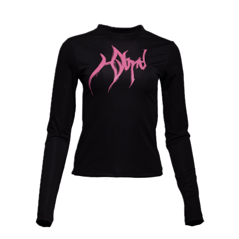 Features the pink HYBRID logo in screen print on the chest and a subtle QR detail on the upper back. Comfortable and form-fitting, ideal for everyday wear or layering.