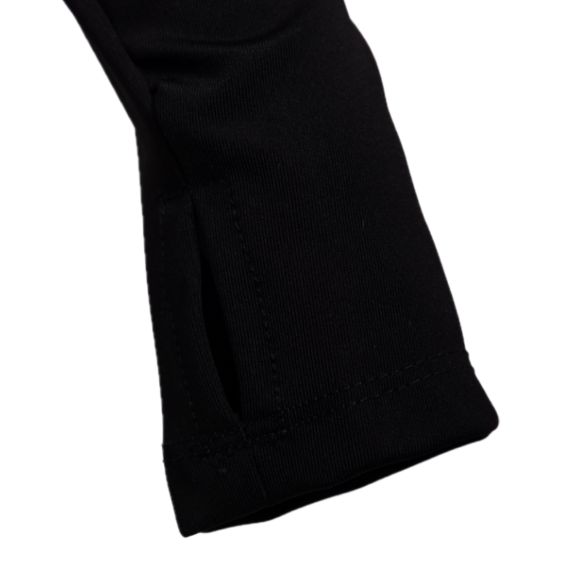 A fitted black long-sleeve top made from soft, stretchy lycra for a sleek silhouette.