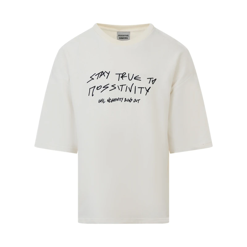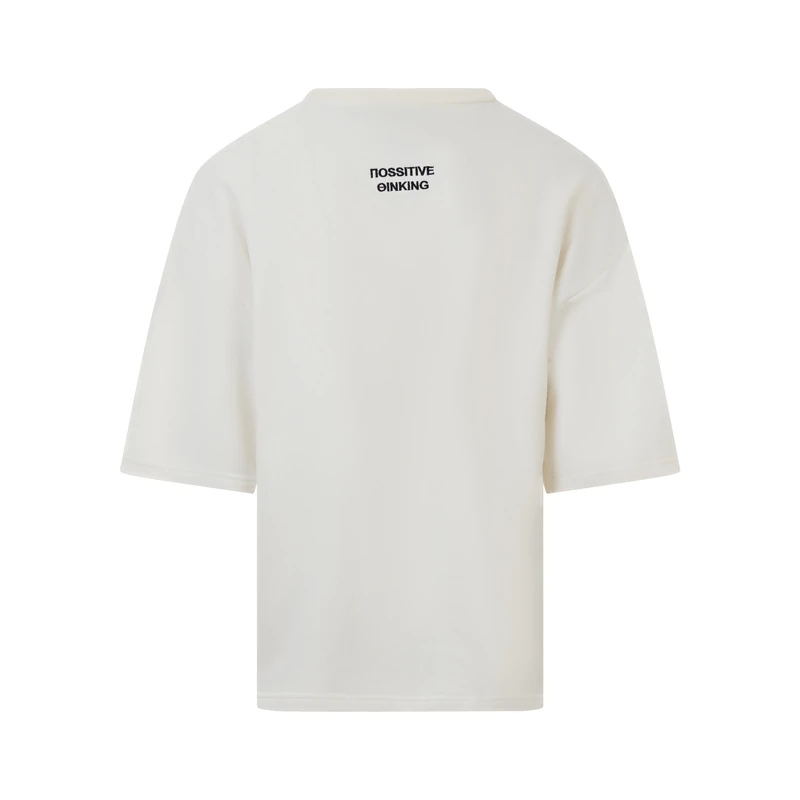 ΠΟSSITIVE ΘINKING off white embroidery ,boxy 3/4 t-shirt . Cut to an oversized & ¾ sleeve •Ribbed crew neck Embroidery logo on the front and on the back • Oversized fit • Exaggerated dropped shoulder Material: french terry Made in Athens, Greece Made in Athens, Greece