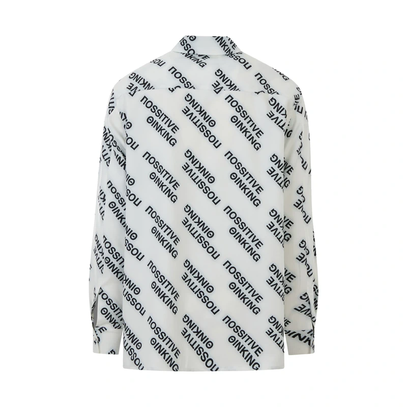 Button-up white shirt features an all-over print in ΠΟSSITIVE ΘINKING logo, crafted from heavy fabric. Cut to a overized unisex fit