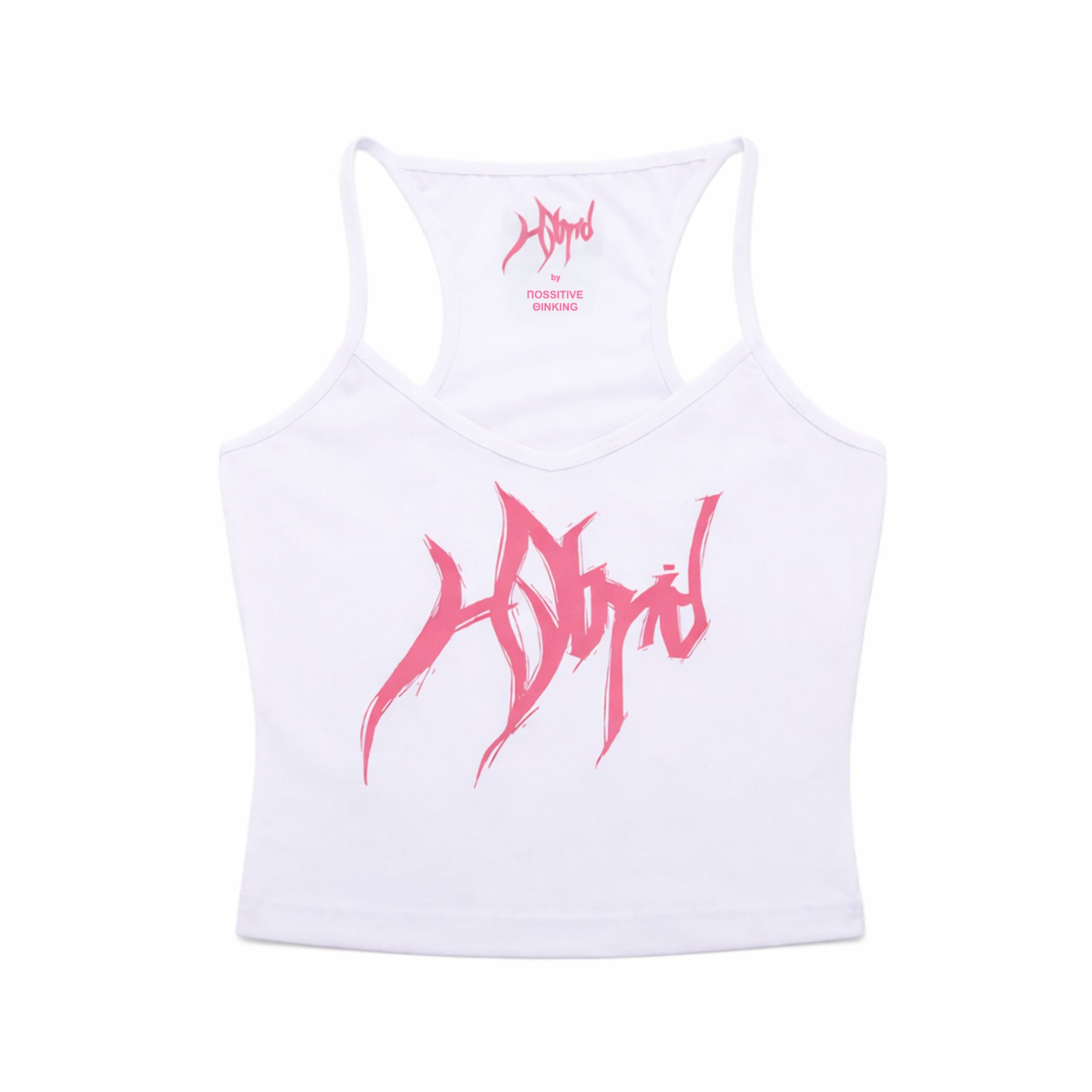 A clean white tank top featuring the pink HYBRΙD silk- printed logo on the front.